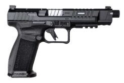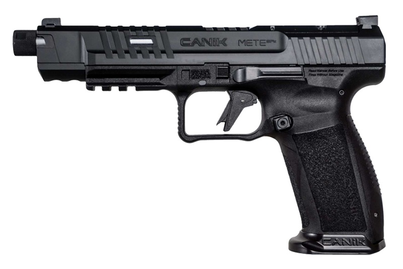 De CANIK Mete SFx Pro beschikt over de superieure technologie en nieuwe functies van de nieuwe METE-serie. De beavertail, waarvan de ergonomie is verbeterd dankzij het vernieuwde frameontwerp van de nieuwe METE-serie, zorgt voor een comfortabelere grip, terwijl de trekkerbeugel een goede grip biedt voor de ondersteunende hand. Een van de nieuwe kenmerken van het pistool is de “Fit and Lock”-functie, die het vergrendelen van het holster vergemakkelijkt. Hierdoor kan de nieuwe METE-serie effectiever worden gebruikt met een geschikt holster. Een ander opvallend kenmerk van het nieuwe frameontwerp is het volledig modulaire ontwerp. Bovendien kan het pistool eenvoudig worden gedemonteerd zonder extra materiaal, afgezien van de meegeleverde CANiK-pons. Deze praktische en nuttige functie wordt mogelijk gemaakt door het nieuwe ontwerp van de dubbelzijdige 36 mm-sledehouder. Het nieuwe frameontwerp met een zelfuitlopende magazijnschacht maakt het wisselen van magazijnen sneller, wat een verschil maakt. De legendarische CANiK-trekker is verkrijgbaar in een polymeer uitvoering met een trekkerhoek van 90⁰. Net als alle pistolen uit de METE-serie is de METE SFx PRO uitgerust met een schuin vizier, waardoor het in een noodsituatie gemakkelijk is om het pistool met één hand te laden. Dit vizier is ook geschikt voor optische richtmiddelen. De nieuwe, optiek-ready slede accepteert alle micro-optieken, met name de Trijicon RMRcc. De METE SFx PRO is voorzien van een vizierset bestaande uit een tritium korrel en een zwart achtervizier, en heeft een 146 mm (5,74 inch) loop met schroefdraad en een beschermkap.